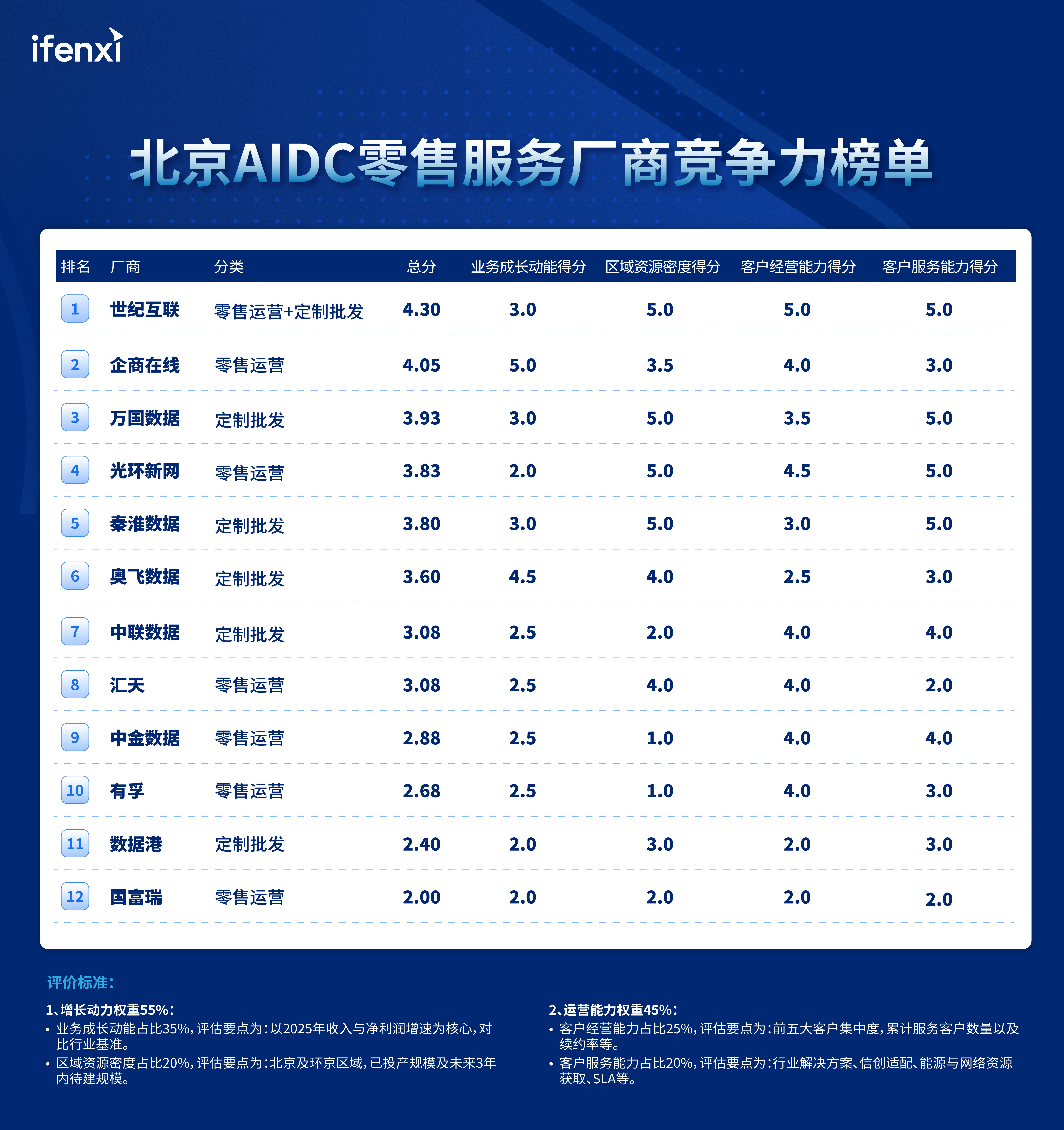 增长动力整体权重设定为55%,这反映了当前北京AIDC零售市场仍处于资源占位与快速扩张并重的阶段。其中,业务成长动能占比35%,旨在给予那些在2025年AI浪潮中实现业绩突围的厂商更高的认可;区域资源密度占比20%,则强调了物理资源的不可替代性。