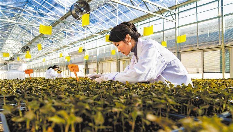 1月14日,浙江省金华市兰溪市梅江镇金线莲数智生产基地种植大棚,工作人员在记录金线莲种苗生防菌实验数据,为林下生态栽培金线莲提供技术保障。