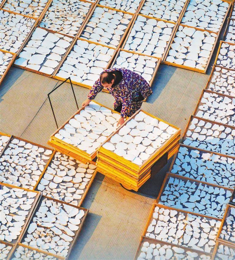 1月18日,安徽省安庆市岳西县莲云乡,村民在晾晒茯苓片。