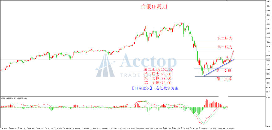 上图为黄金1小时图。从形态结构看,金价暴跌后在关键支撑位4400.0美金附近止跌企稳,开始了一轮强势反弹浪行情,目前已经反弹至新高5050.0美金附近。从k线上看,多头反弹是强势阳线反攻节奏,表明多头力量较强,且沿着上涨趋势线不断震荡向上,持续性较强,后市有望继续新高反弹,关注短线目标压力位回落节奏。综合MACD指标看快慢线低位金叉信号形成,表明多头开启了反攻之路。策略上建议顺多头浪节奏找支撑位埋伏多单思路为主。
